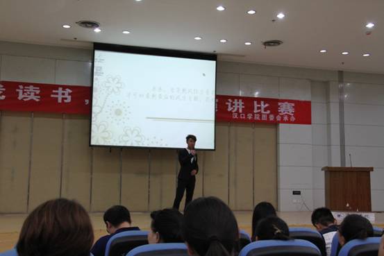 本次活动以“我读书,我快乐”为主题。有文法学院、经济学院等八个学院的学生参加了此次活动。活动流程清晰流畅,规则简单,操作性强。令选手和观众乐在其中。比赛分为两轮。第一轮“演讲我最霸”。参赛者按照抽签顺序依次上台进行五分钟的演讲,评委打分,分数从高到低进行排序,获得前六名的选手进入下一轮。本环节中,有的选手对酒当歌,将肢体语言与演讲相结合,超然地抒发着自己的感慨;有的选手自信大方,认真生动地讲述着自己与书的故事。参赛选手将自己独到的见解及从书中体会到的人生真谛融汇在5分钟的演讲中,给现场观众带来了一场震撼的演说。第二轮“博文我最强”。参赛者在规定时间内回答主持人提出的名著问答题,有两次现场求助的机会,答对题目最多者胜。本环节不但考验了参赛者的阅读量也令现场观众参与其中,体会到了比赛的乐趣。最终,比赛第一名由书友会的陈力东同学获得。