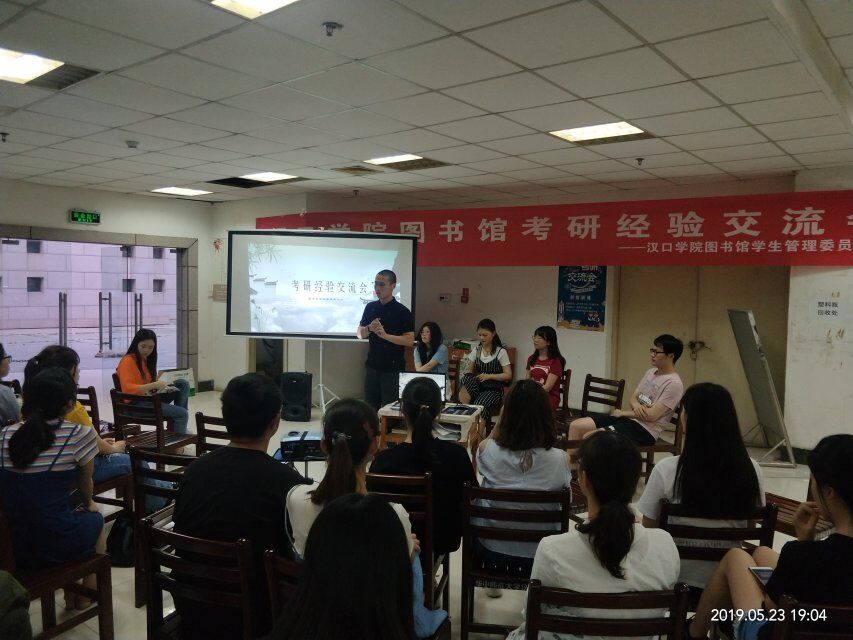 为进一步加强汉口学院考研学子对考研经验的学习了解,同时营造积极向上的学风、掌握相关考研技巧。在2019年5月23日,由汉口学院图书馆主办的考研交流会在考研自习室一楼举行。本次活动,我们邀请了在前几届全国研究生考试中成绩优秀的同学分享他们的经验。图书馆学生管理委员会承办了本次活动。