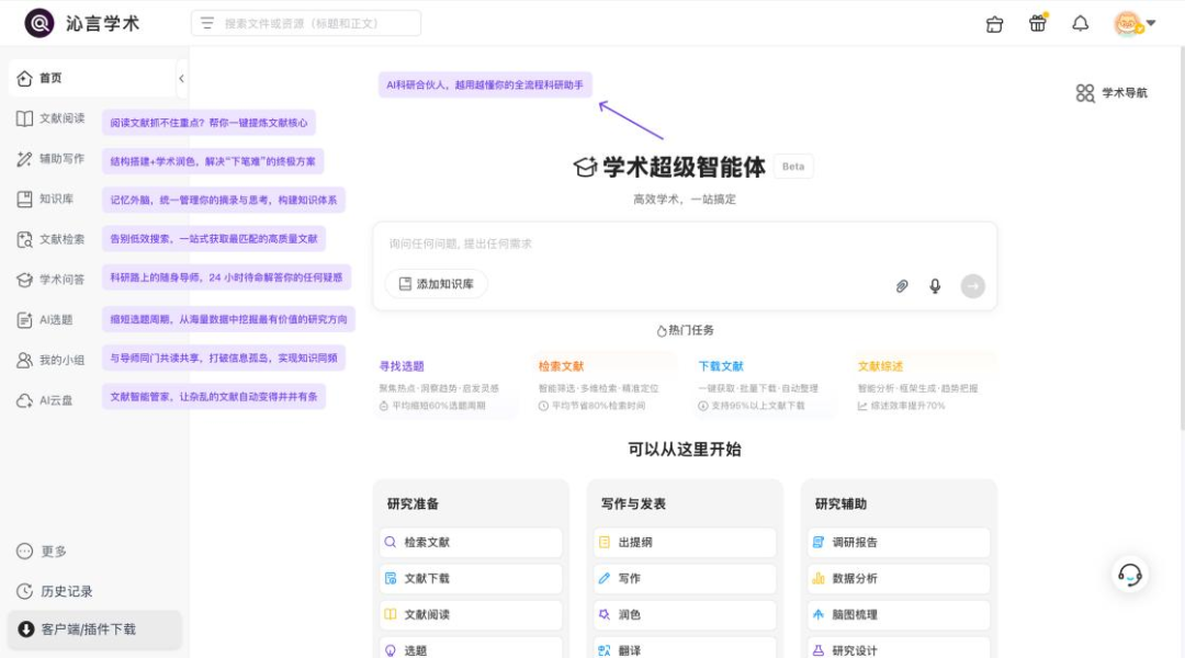 注册成功后即可自动解锁无限次AI对话、极速文献解析、高级写作辅助等服务。