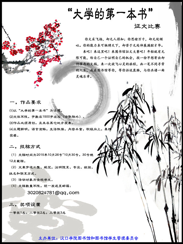 请以“大学的第一本书”为话题,写一篇文章,内容积极健康,要求原创,字数在1500字左右,于2015年10月30日晚12点截稿。请将稿件发送至:3020824781@qq.com,神秘大奖等你来拿~ 不见不散!