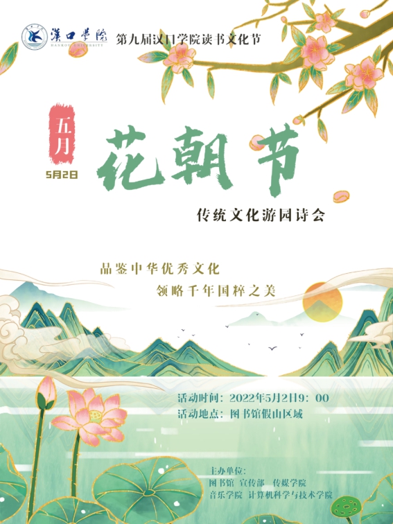 5月2号我们将联合多个学院和社团举行花朝节传统文化游园诗会活动。届时活动现场设置了飞花令、诗词接龙、投壶等各式各样的传统游戏,还准备了精彩的民乐、古典舞蹈、诗歌朗诵等表演。藉由这些文化体验活动,构建一个交流平台,让优秀传统文化穿越千年来与我们相遇,使同学们能一同体验千年国学文化精粹!
