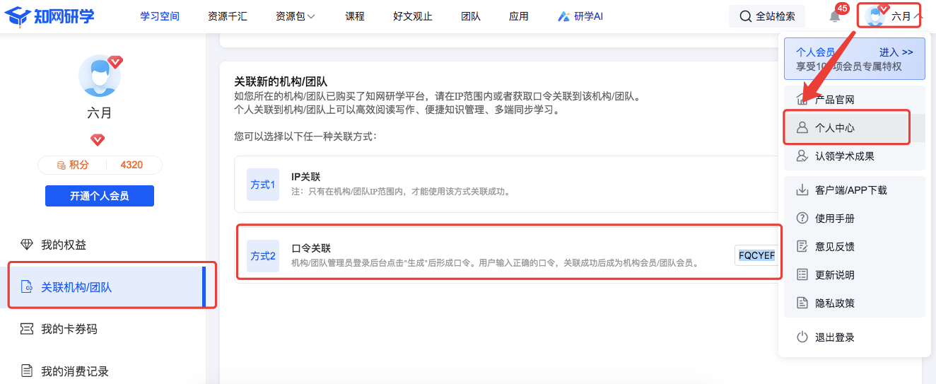 个人账号与机构账号关联:选择个人账号下拉菜单中“个人中心”,点击左侧菜单“关联机构/团队”,选择方式二“口令关联”,输入口令(只需关联一次,下次直接登录个人账号即可,无需再次关联)