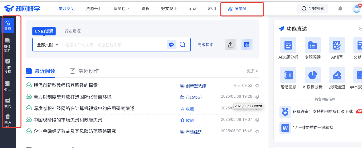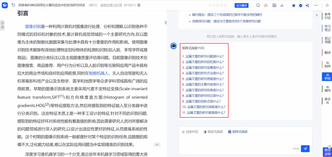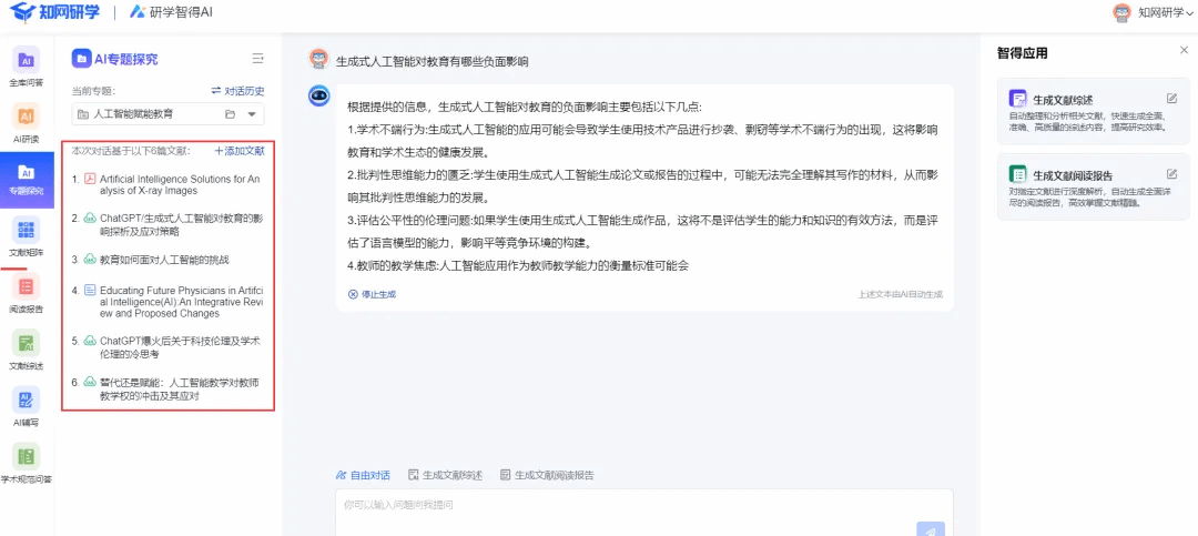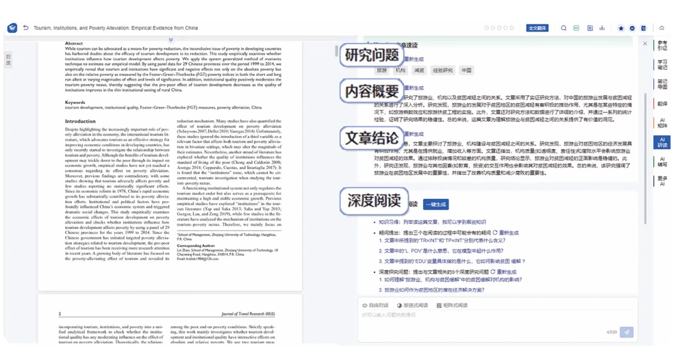 涵盖AI选题分析、AI资源检索、AI阅读理解、AI文档写作、AI学习评估、文献管理等全场景应用,帮助用户提高科研效能,加速学术创新。为帮助广大师生更便捷高效地进行学术研究、文献研读、文献分析与管理。