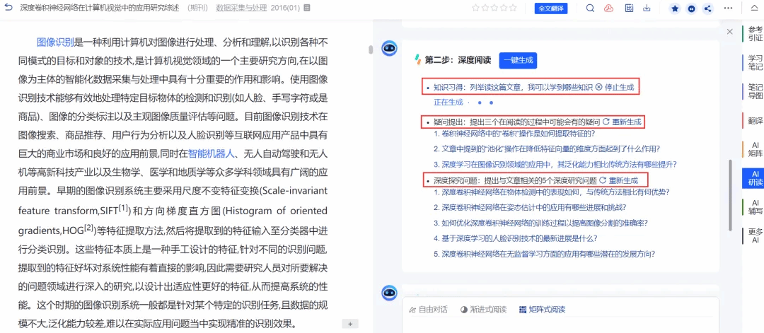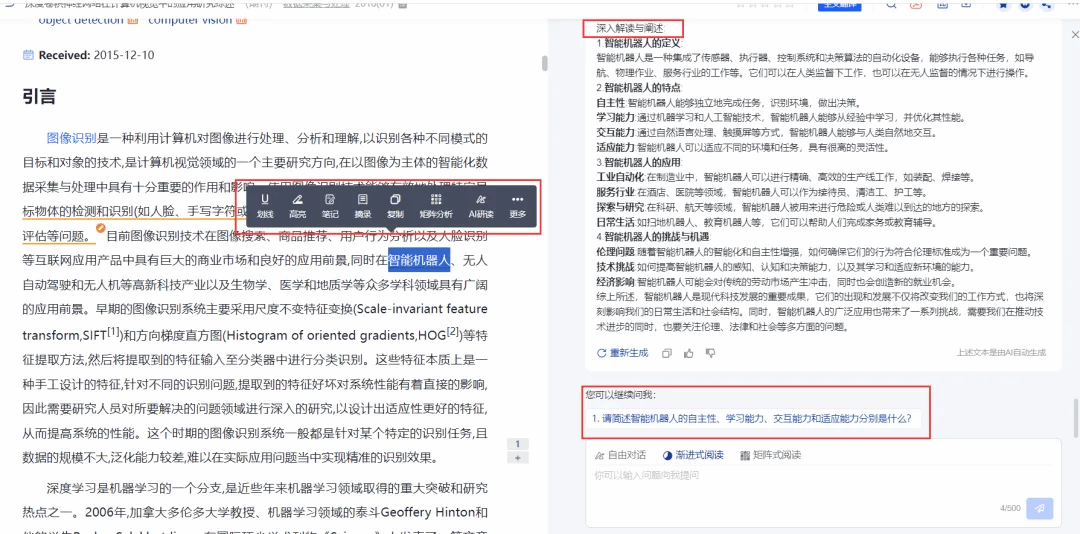 阅读文献时,可以进行内容速览、全文翻译、深度研读、拓展阅读、概念解释、矩阵分析、参考文献一键跳转、划线、高亮、文摘、笔记等功能,大幅提高阅读效率和知识吸收率。