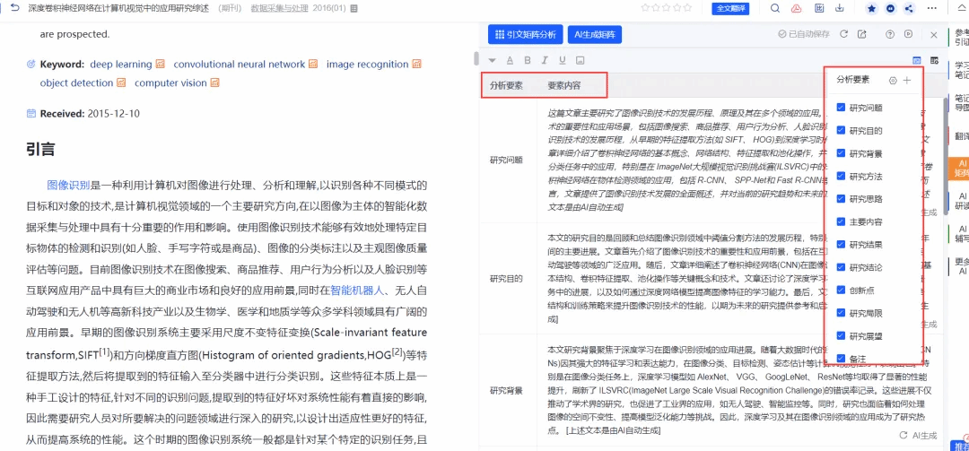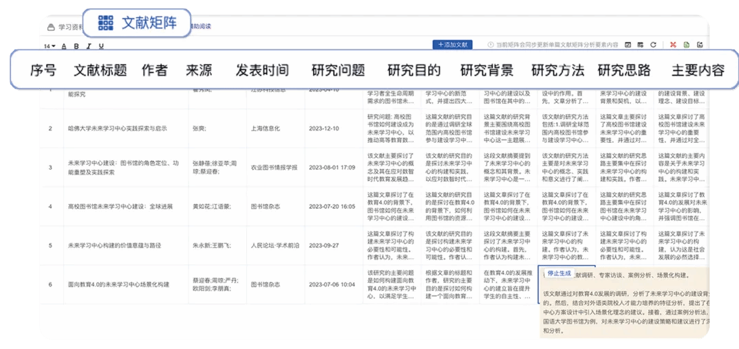 > 自动分析和提取每篇文章的研究问题、方法、内容等11个研究要素,构建文献矩阵