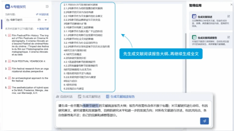 根据自己选定的多篇文献,AI生成文献阅读报告的大纲和全文。