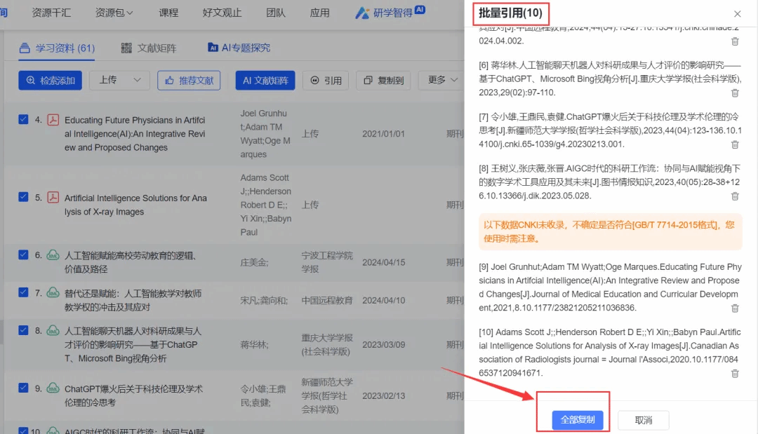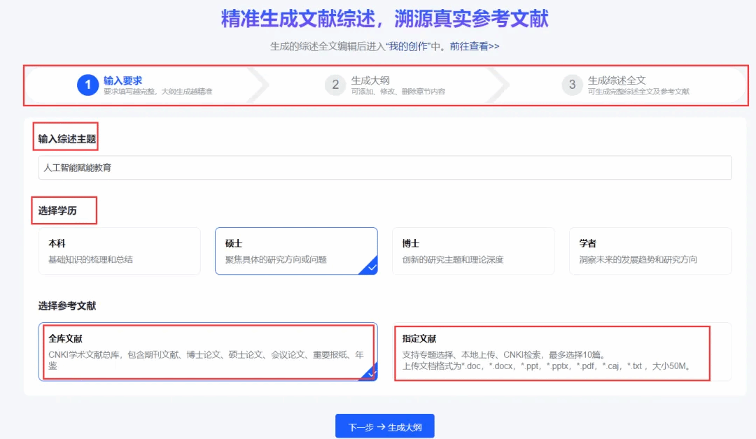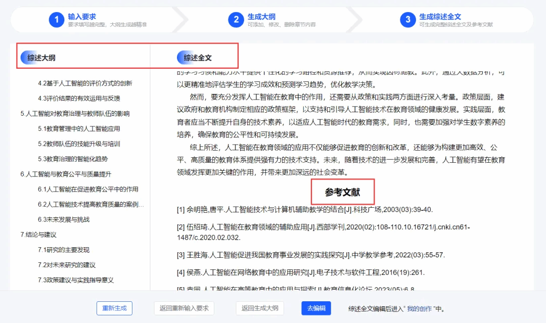 AI可以基于知网全库文献,或基于大家自己选定的一组文献,生成文献综述的大纲和全文,并注明内容来源及参考文献列表。