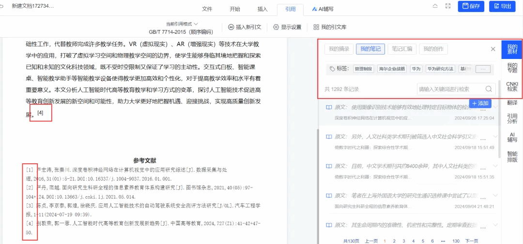 插入划线、高亮、文摘 、知网文献时,自动生成文内、文末的参考文献,参考文献样式可以一键切换和自定义编辑。