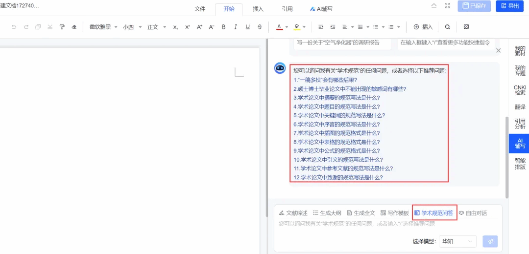 >提供学术规范知识库,可以向AI提问学术规范、论文写作要求、科研诚信、学术伦理等问题,AI实时解答,提升写作质量和效率。
