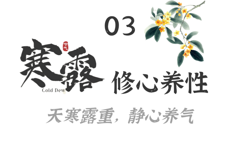 寒露至,秋意浓,在这冷热交替的时节,宜早睡早起,避免着凉。晨起时可泡一杯蜂蜜水润喉,饮食上可多煮山药粥养脾。正所谓“白露身不露,寒露脚不露”,寒露时节尤其要做好足部保暖。自古以来还有“寒露吃芝麻”的习俗。芝麻具有排毒的功效,在《神农本草经》和《本草纲目》等医药学专著里享有很高的评价,可广泛应用于养生食疗。