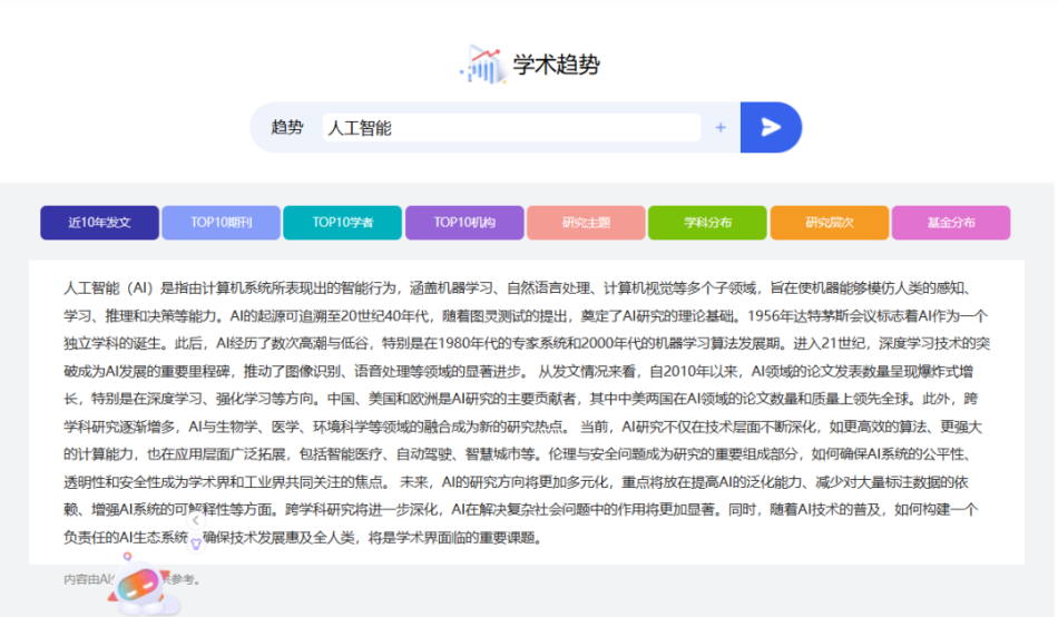 你是否曾为繁琐的文献调研而头疼?CNKI AI“学术趋势”可进行智能分析并总结领域概貌,从基本概念、发展历程到发文情况、研究现状,一应俱全。只需输入想要了解的研究主题,即可全面解锁来龙去脉,为研究之路奠定坚实基础。