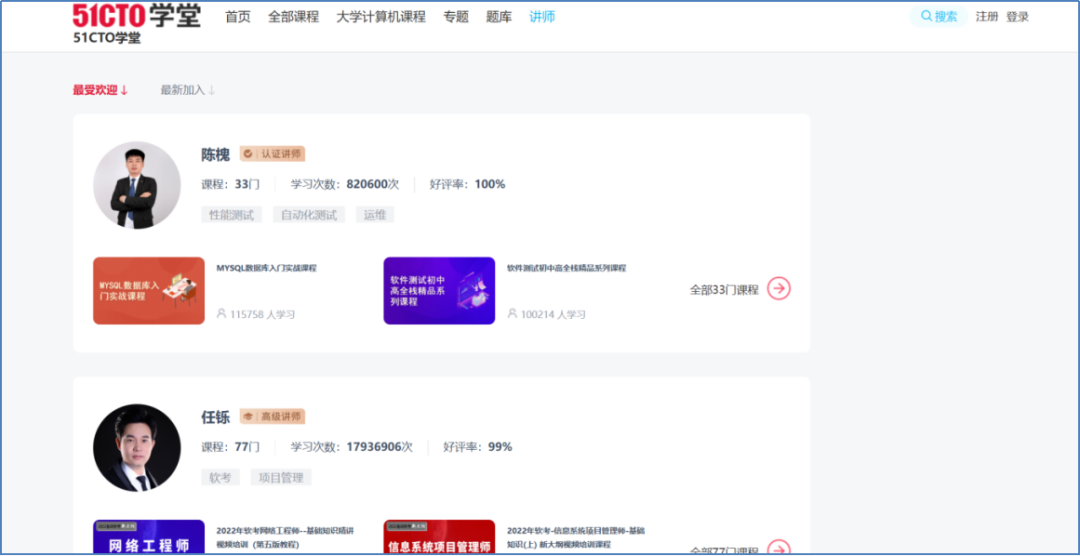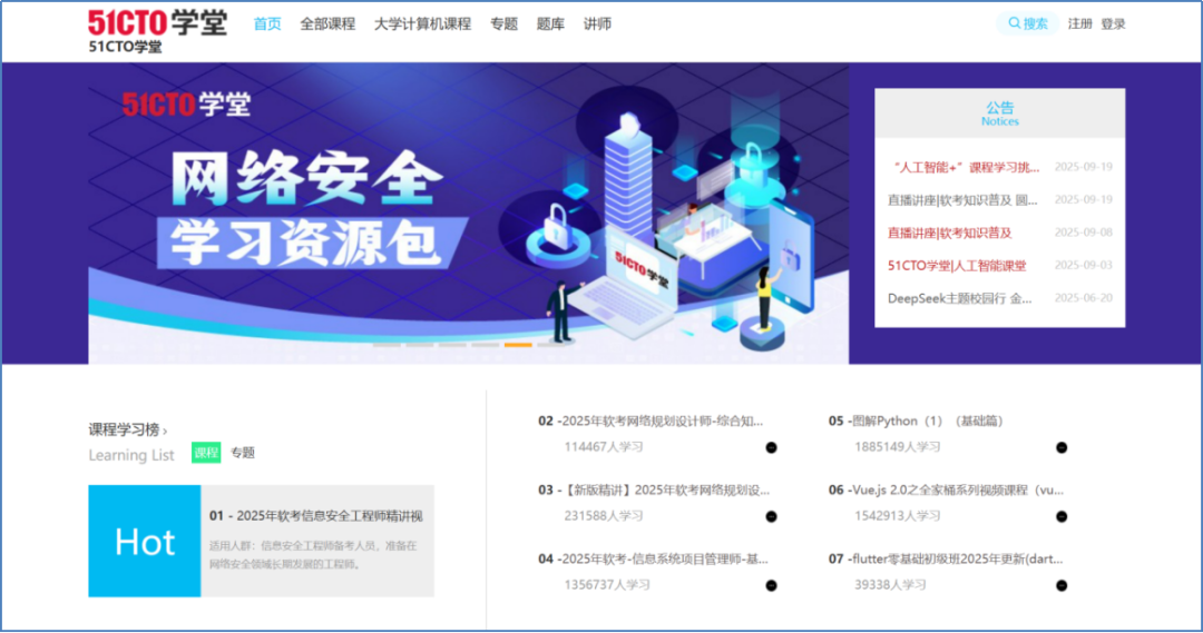51CTO学堂作为专业的数字化人才学习平台,拥有众多优质、专业并极富实战应用性的自助式培训课程,由数百位优质讲师打造,覆盖后端开发、IoT物联网、运维、云计算、办公应用、网络技术、AI人工智能等众多主流信息技术领域。