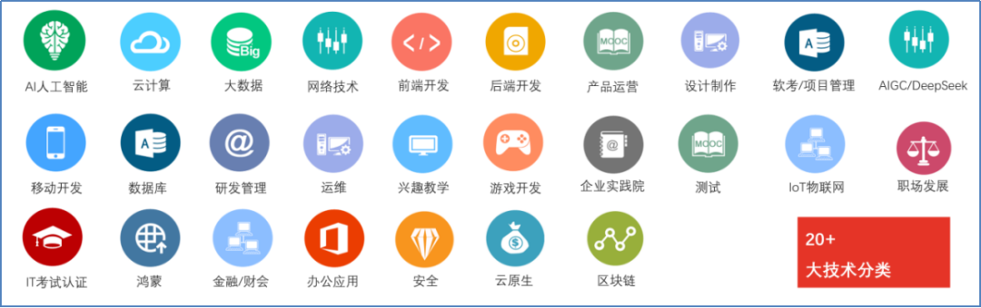 20+大技术分类,100多个细分技术领域的在线课程,简单的、复杂的、专业的、常用的,各种课程应有尽有;