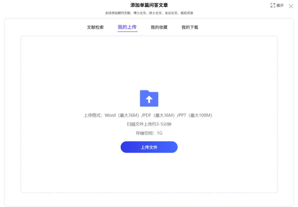 贴心提示:支持Word(最大36M)、PDF(最大36M)、PPT(最大100M)格式的文件上传,且上传总存储空间高达1G,足够存放你的重要文献。