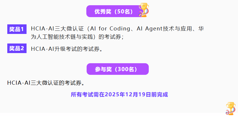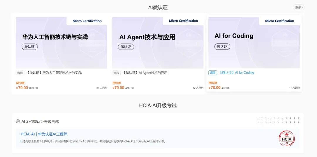 华为微认证“3+1”升级计划架起进入ICT职业快通道的桥梁,通关指定范围内的三门微认证(AI for Coding、AI Agent 技术与应用、华为人工智能技术链与实践)后,参加通过一门 升级考试即可获得AI工程师职业认证HCIA-AI。