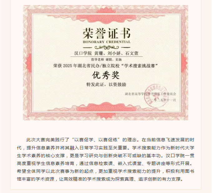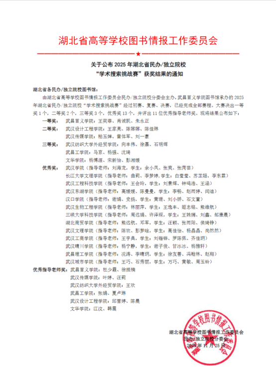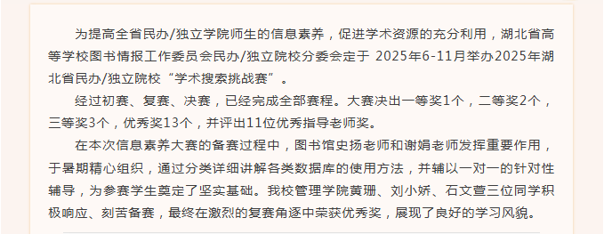 【喜报】我校学子荣获2025年湖北省民办/独立院校 “学术搜索挑战赛”优秀奖