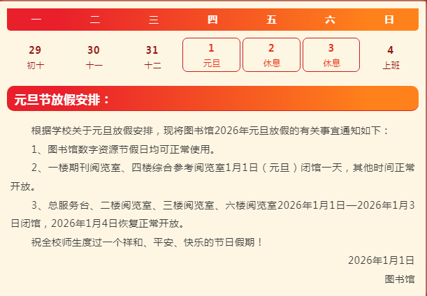 【馆务通知】图书馆2026年元旦放假通知