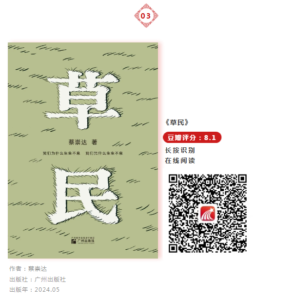 600万册畅销书作家蔡崇达的“故乡三部曲”收官之作,豆瓣2024年度中国文学TOP3!蔡崇达说,“人们总是需要故乡……我们只有知道故乡如何构成我们,我们才能知道,自己如何探向远方”。如果你在外漂泊,《草民》就是一本能让你精神返乡的书。