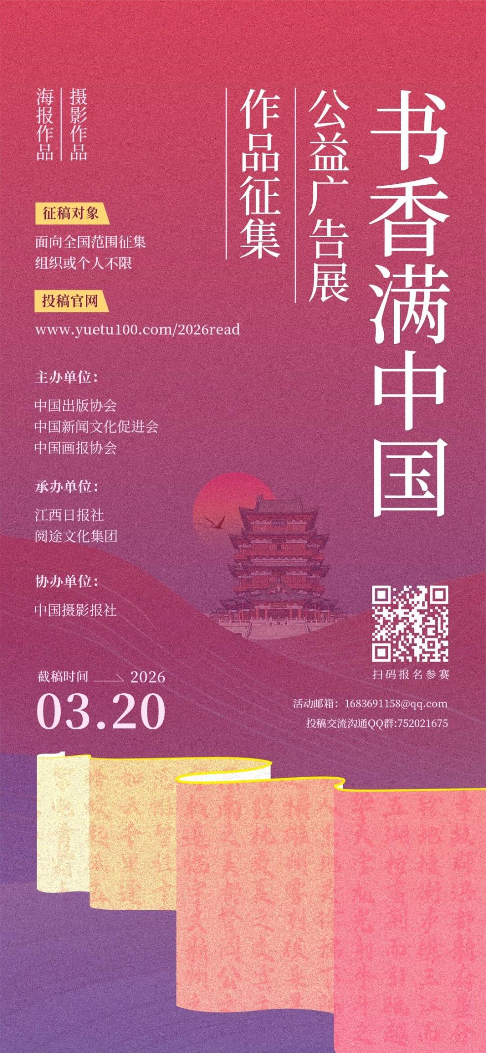 为深入贯彻落实党的二十大关于深化全民阅读活动的重要部署,严格落实《全民阅读促进条例》要求,积极响应国务院批复设立“全民阅读活动周”的工作安排,弘扬阅读文化、凝聚读书力量,营造浓厚的全民阅读氛围,特举办2026年“书香满中国”公益广告展作品征集活动,面向全国征集全民阅读主题优秀海报、摄影作品,入选作品将在第五届全民阅读大会进行展览展示及相关应用。