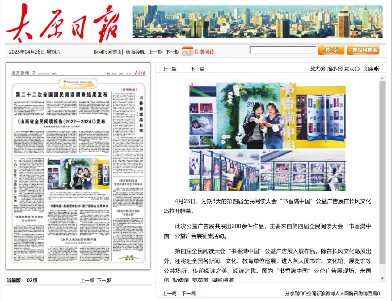 以下为2025年第四届全民阅读大会“书香满中国”公益广告展现场照片及媒体报道。