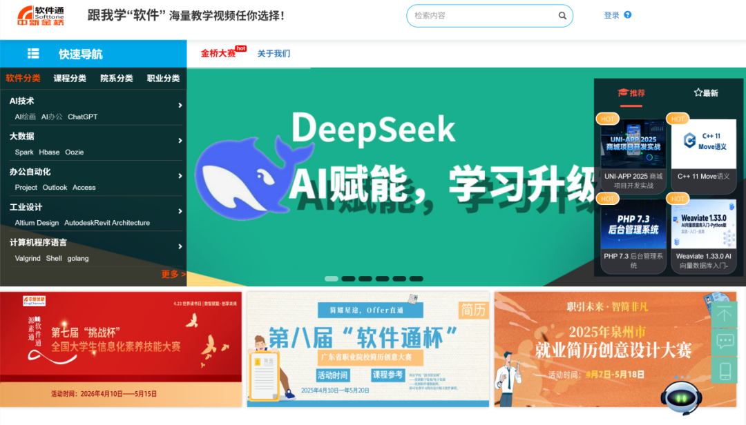 “软件通”是一款根据高校学生学习需求,在线学习各种软件的技能的视频数据库,通过微课录屏的方式,包含商业、创意、IT技术三大方向的视频课程——300多种软件,8万多个视频,满足各专业的学生对于软件学习的需求。